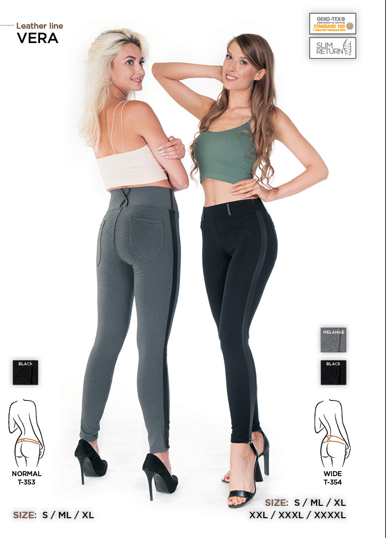 Dámské elegantní legíny z pevného materiálu, který dokonale obtáhne a zároveň Vás neomezí v pohybu. Vysoký pás široký 9 cm vytvaruje ploché bříško. Pokud si chcete pás ozdobit opaskem tak poslouží Vám poutka z černé eko-kůže. Na boku nohavic všitý pás černé eko-kůže opticky prodlouží nohy a přidá Vám na eleganci.